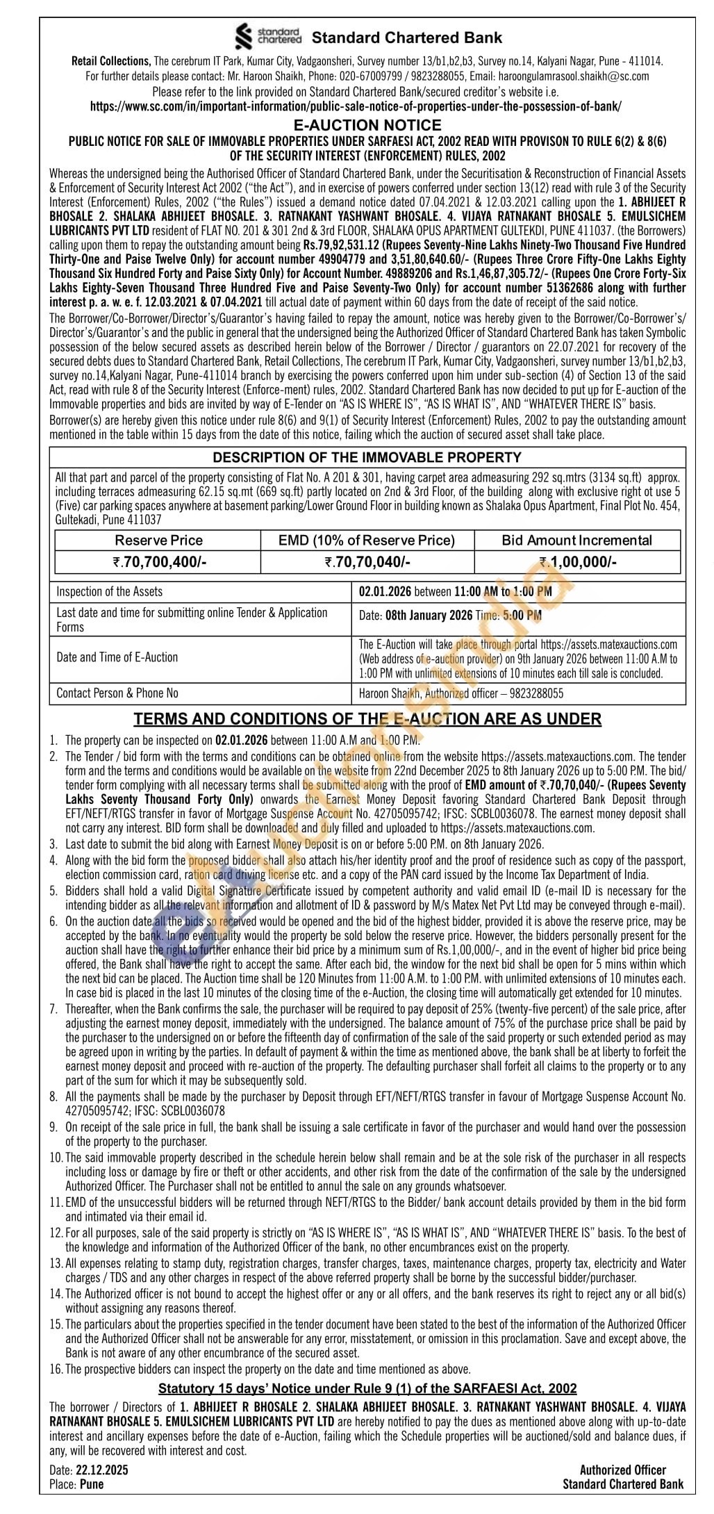 All that part and parcel of the property consisting of Flat No. A 201 & 301, having carpet area admeasuring 292 sq mtrs (3134 sq.) approx. including terraces adneasuring 62.15 sq.mt (569 sq.ft) partly located on 2nd & 3rd Floor of the building along with exclusive right of use 5 (Five) car parking spaces anywhere at basement parking/Lower Ground Floor in building known as Shalaka Opus Apartment, Final Plint No. 454. Gultekadi, Pune 411037