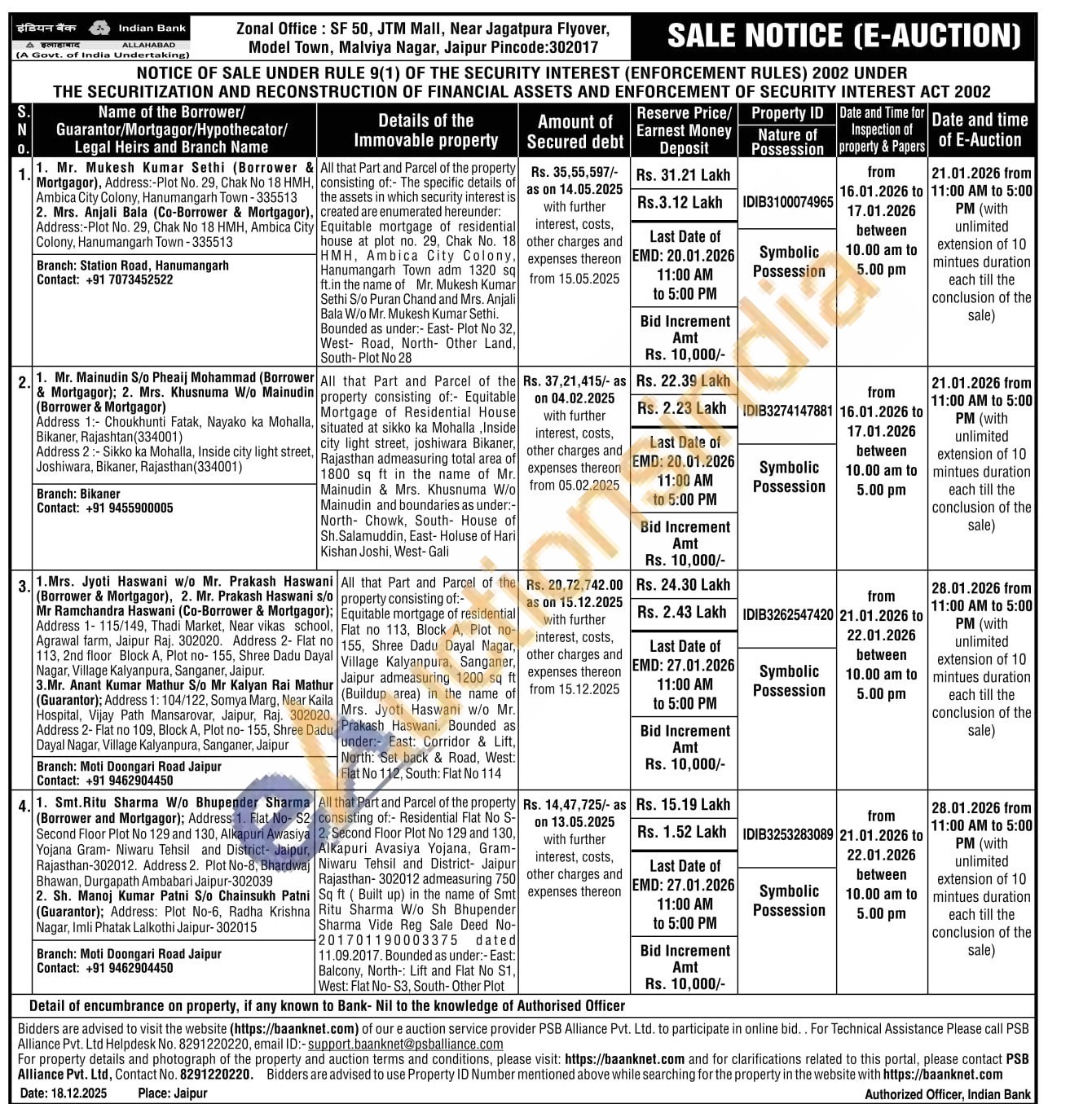 All that Part and Parcel of the property consisting of:- Equitable mortgage of residential Flat no 113, Block A, Plot no-155, Shree Dadu Dayal Nagar, Village Kalyanpura, Sanganer, Jaipur admeasuring 1200 sq ft (Buildup area) in the name of Mrs. Jyoti Haswani w/o Mr. Prakash Haswani. Bounded as under: East: Corridor & Lift, North: Set back & Road, West: Flat No 112. South: Flat No 114