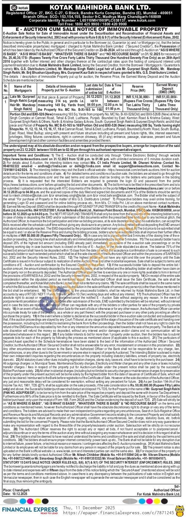All that piece & parcel of Property measuring 314 sq. yards i.e. measuring 149 Sq. Yards from the Property No. MC No. B-XI-165 to 168 Portion Old and BXII-526 (New) measuring 165 Sq. Yards from property No. MC No. B-XII-526(Old) and BXII-526/B (New) at Amar Singh Complex at Camran Road, Tehsil & Distt. Ludhiana, Punjab. Bounded by East: Kamran Road & Krishna Galaxy, West: Gurpreet Singh Rekhi & Others, North: & Krishna Galaxy & Arora, South: Gurpreet Singh Rekhi & Gurpreet Singh Rekhi; andAll that piece and Parcel of Property No. MC B-XI-165 to 168/Portion Old and BXII-526 (New) measuring 500 Sq. Yards having eight Shops No. 11, 12, 13, 14, 15, 16, 17, 18 at Camran Road, Tehsil & Distt. Ludhiana, Punjab, Bounded by North: Road, South: Builtup, East: Road, West Builtup; along with present and future structure including all present and future rights, title, interest easement, privileges, fitting fixtures connections, right in common driveway, lift (if any) entrance, passage, staircase, present and future developmentrightand other common facilities and amenities provided therein.