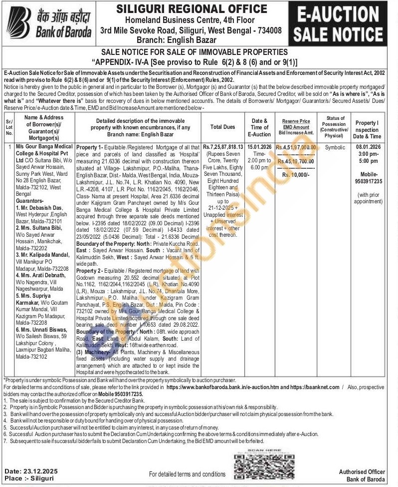Equitable/Registered Mortgage of all that piece and parcels of land classified as Hospital measuring 21.6336 decimal with construction thereon situated at Village Lakshmipur, P.O.-Maliha, Thana-English Bazar, Dist.- Malda, West Bengal, India, Mouza-Lakshmipur, J.L. No.74, L.R. Khatian No. 4090, New L.R.-4208, 4107, L.R Plot No. 1162/2045, 1162/2046, Class- Nama at present Hospital, Area 21.6336 decimal under Kajigram Gram Panchayet owned by M/s Gour Banga Medical College & Hospital Private Limited acquired through three separate sale deeds mentioned below. 1-2395 dated 18/02/2022 (09.00 Decimal) 1-2396 dated 18/02/2022 (07.59 Decimal) 1-8433 dated 23/05/2022 (5.0436 Decimal): Total 21.6336 Decimal Boundary of the Property: North: Private Kuccha Road. East: Sayed Anwar Hossain. South Vacant land of Kalimuddin Sekh, West: Sayed Anwar Hossain & 6 ft. wide path.