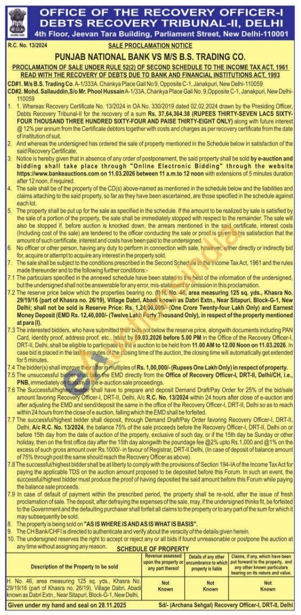 H. No. 46, area measuring 125 sq. yds.. Khasra No 29/19/16 (part of Khasra no. 26/19), Village Dabri, Abadi known as Dabri Extn., Near Sitapuri, Block-G-1, New Delhi