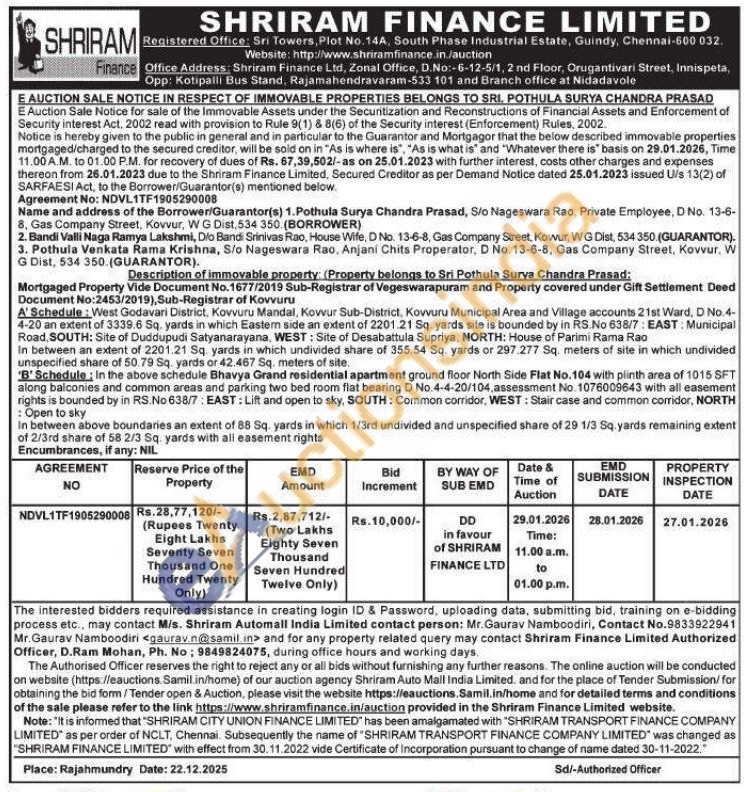Mortgaged Property Vide Document No.1677/2019 Sub-Registrar of Vegeswarapuram and Property covered under Gift Settlement Deed Document No:2453/2019), Sub-Registrar of Kovvuru A' Schedule: West Godavari District, Kovvuru Mandal, Kovvur Sub-District, Kovvuru Municipal Area and Village accounts 21st Ward, D No.4-4-20 an extent of 3339.6 Sq. yards in which Eastern side an extent of 2201.21 Sq. yards site is bounded by in RS.No 638/7: EAST: Municipal Road, SOUTH: Site of Duddupudi Satyanarayana, WEST: Site of Desabattula Supriya, NORTH: House of Parimi Rama Rao In between an extent of 2201.21 Sq. yards in which undivided share of 355.54 Sq. yards or 297.277 Sq. meters of site in which undivided unspecified share of 50.79 Sq. yards or 42.467 Sq. meters of site. 'B' Schedule; in the above schedule Bhavya Grand residential apartment ground floor North Side Flat No.104 with plinth area of 1015 SFT along balconies and common areas and parking two bed room flat bearing D No. 4-4-20/104, assessment No. 1076009643 with all easement rights is bounded by in RS.No 638/7: EAST: Lift and open to sky, SOUTH: Common corridor, WEST: Stair case and common corridor, NORTH : Open to sky In between above boundaries an extent of 88 Sq. yards in which 1/3rd undivided and unspecified share of 29 1/3 Sq. yards remaining extent of 2/3rd share of 58 2/3 Sq. yards with all easement rights