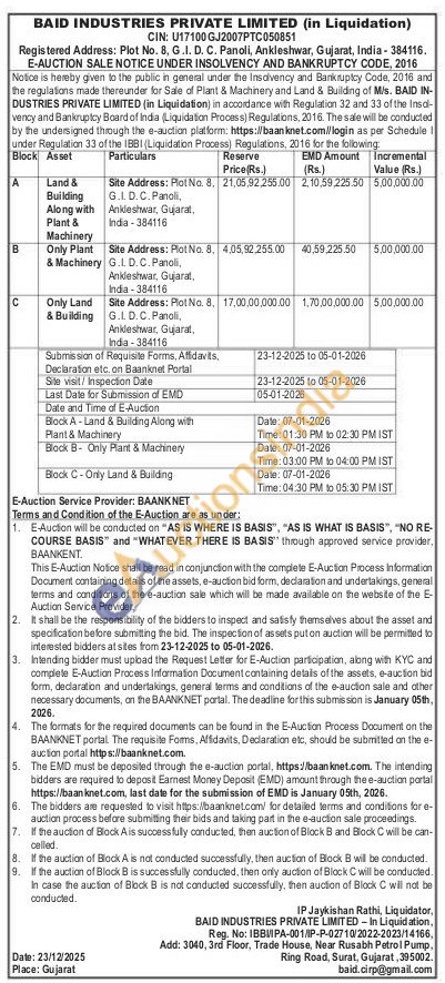 Only Plant & MachinerySite Address: Plot No. 8, G.L. D. C. Panoli, Ankleshwar, Gujarat, India-384116