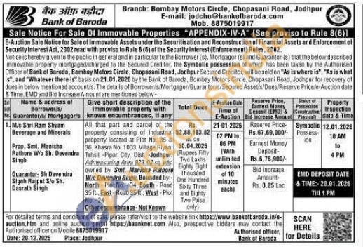 All that part and parcel of the property consisting of Industrial property located at Plot No. 35 & 36. Khasra No. 1003, Village Riyan, Tehsil -Pipar City, Dist. Jodhpur. Admeasuring Area 923. 03 52 owned by Smt. Manisha Rathore Wio Devendra Singh, Bounded by North Plot No. 34. South Ruad 35 ft. East-Road 35 ft. West-Plot No.-24