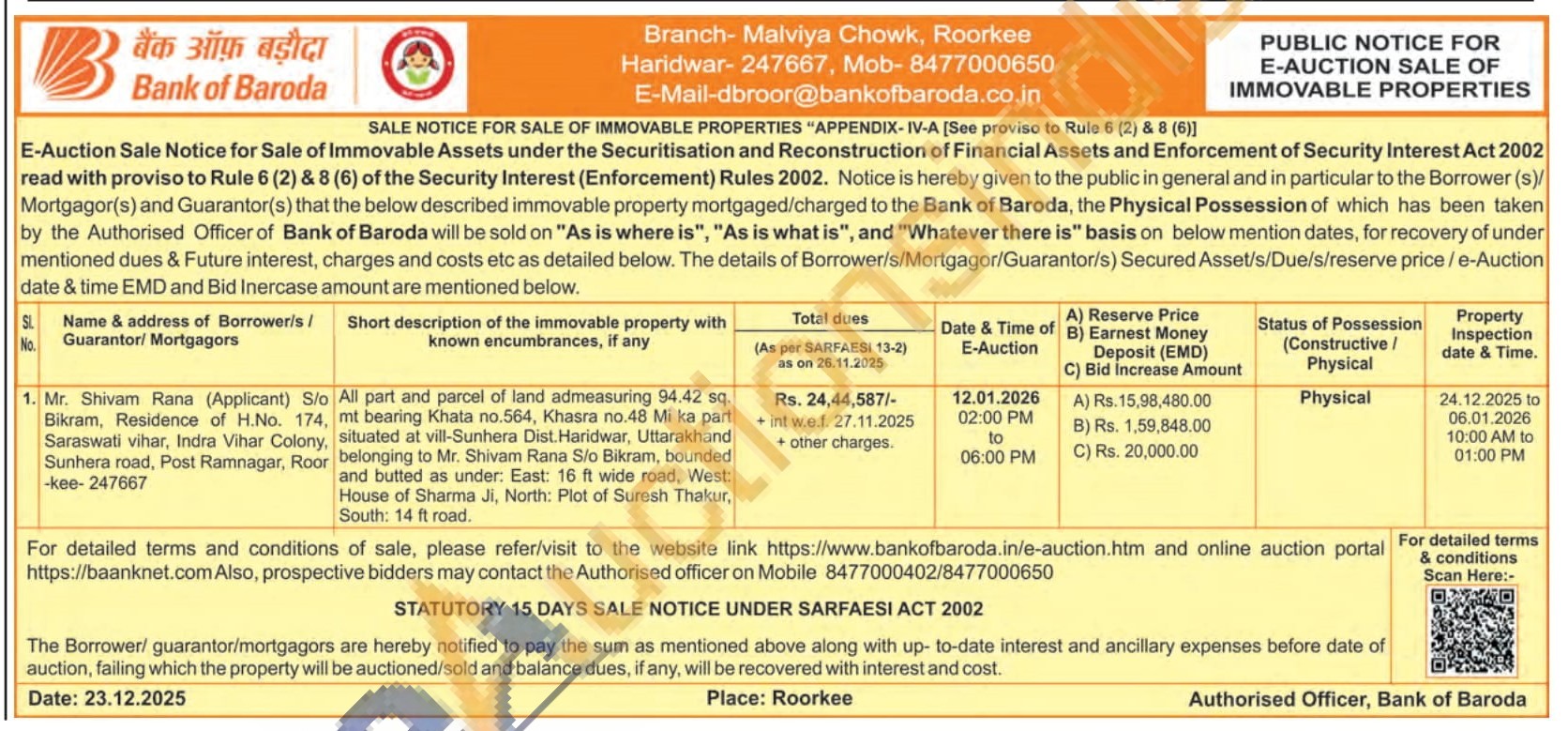 All part and parcel of land admeasuring 94.42 sq. 174, mt bearing Khata no.564, Khasra no.48 Mi ka part Colony, situated at vill-Sunhera Dist. Haridwar, Uttarakhand Roor belonging to Mr. Shivam Rana S/o Bikram, bounded and butted as under. East: 16 ft wide road, West: House of Sharma Ji, North: Plot of Suresh Thakur, South: 14 ft road.