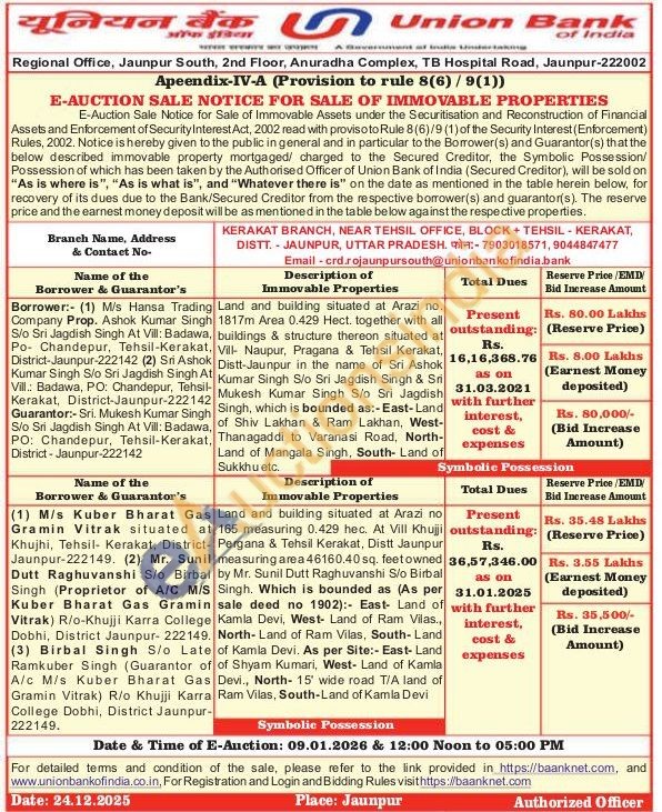 Land and building situated at Arazi no. 1817m Area 0.429 Hect. together with all buildings & structure thereon situated at Vill- Naupur, Pragana & Tehsil Kerakat, Distt-Jaunpur in the name of Sri Ashok Kumar Singh Sio Sri Jagdish Singh & Sri Mukesh Kumar Singh S/o Sri Jagdish Singh, which is bounded as:-East-Land of Shiv Lakhan & Ram Lakhan, West-Thanagaddi to Varanasi Road, North-Land of Mangala Singh, South- Land of