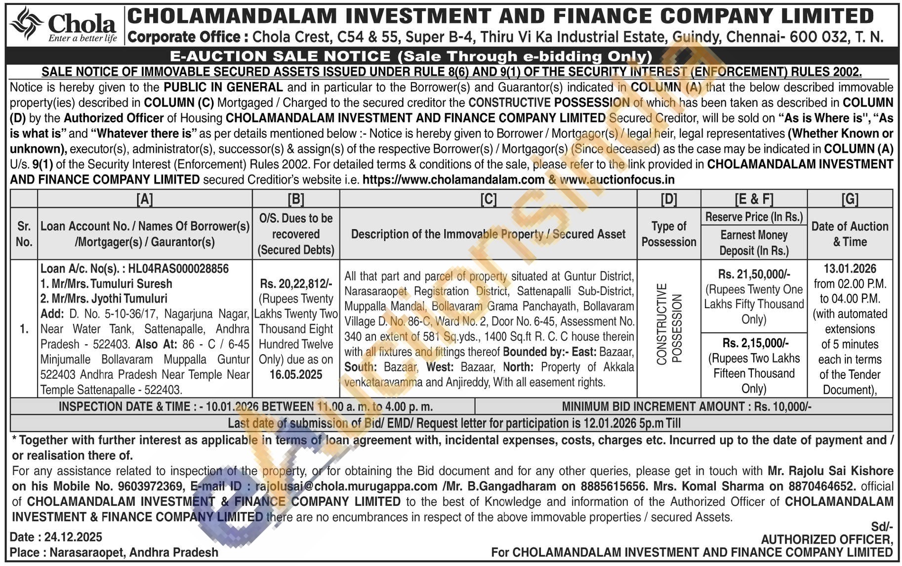 All that part and parcel of property situated at Guntur District, Narasaraopet Registration District, Sattenapalli Sub-District, Muppalla Mandal, Bollavaram Grama Panchayath, Bollavaram Village D. No. 86-C, Ward No. 2, Door No. 6-45, Assessment No. 340 an extent of 581 Sq.yds., 1400 Sq.ft R. C. C house therein with all fixtures and fittings thereof Bounded by:- East: Bazaar, South: Bazaar, West: Bazaar, North: Property of Akkala venkataravamma and Anjireddy, With all easement rights