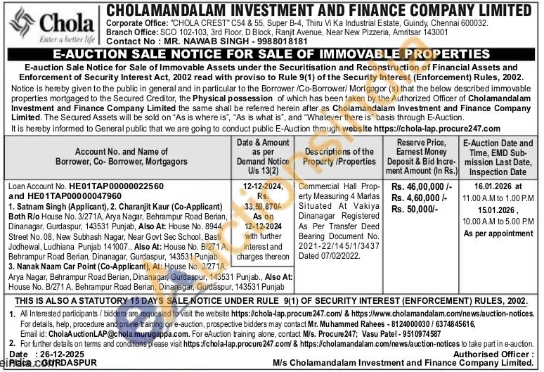 Commercial Hall Prop-erty Measuring 4 Marlas Situated At Vakiya Dinanagar Registered As Per Transfer Deed Bearing Document No. 2021-22/145/1/3437 Dated 07/02/2022
