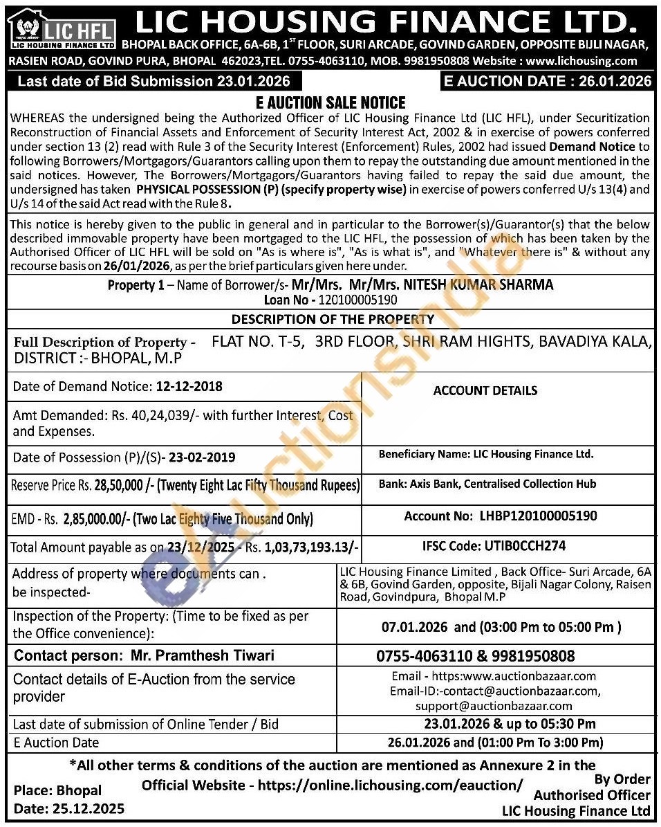 DESCRIPTION OF THE PROPERTY : Full Description of Property FLAT NO. T-5, 3RD FLOOR, SHRI RAM HIGHTS, BAVADIYA KALA, DISTRICT:- BHOPAL, M.P