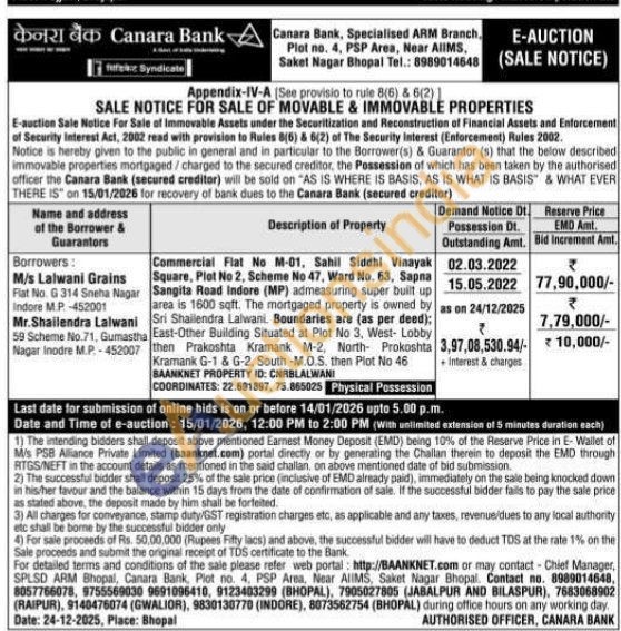 Commercial Flat No M-01, Sahil Siddhi Vinayak Square, Plot No 2, Scheme No 47, Ward No. 63, Sapna Sangita Road Indore (MP) admeasuring super built up area is 1600 sqft. The mortgaged property is owned by Sri Shailendra Lalwani. Boundaries are (as per deed); East-Other Building Situated at Plot No 3, West- Lobby then Prakoshta Kramank M-2, North Prokostita Kramank G-1 & G-2, South -M.O.S. then Plot No 46