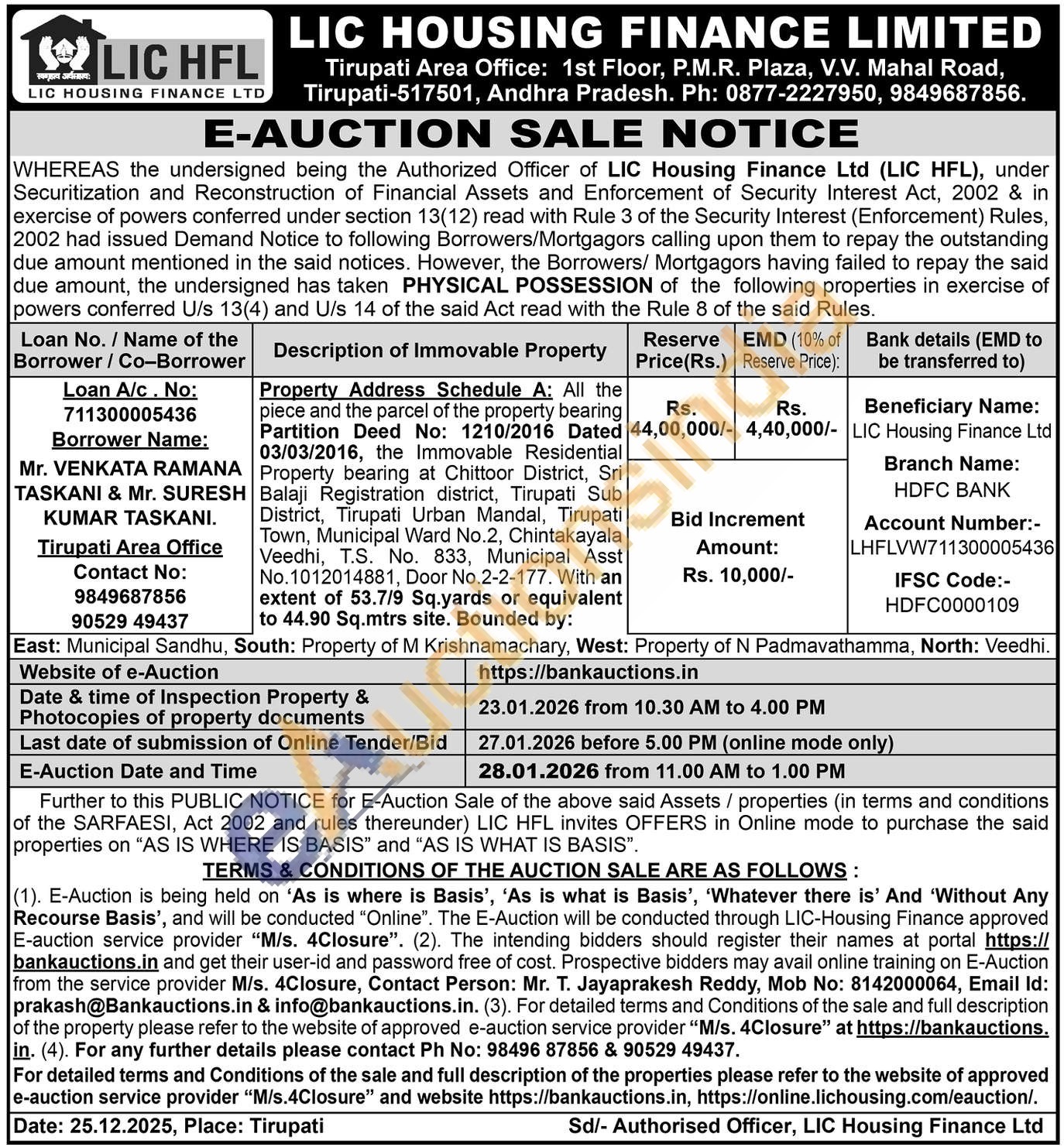 Property Address Schedule A: All the piece and the parcel of the property bearing Partition Deed No: 1210/2016 Dated 03/03/2016, the Immovable Residential Property bearing at Chittoor District, Sri Balaji Registration district, Tirupati Sub District, Tirupati Urban Mandal, Tirupati Town, Municipal Ward No.2, Chintakayala Veedhi, T.S. No. 833, Municipal Asst No.1012014881, Door No.2-2-177. With an extent of 53.7/9 Sq.yards or equivalent to 44.90 Sq.mtrs site. Bounded by:East: Municipal Sandhu, South: Property of M Krishnamachary, West: Property of N Padmavathamma, North: Veedhi.