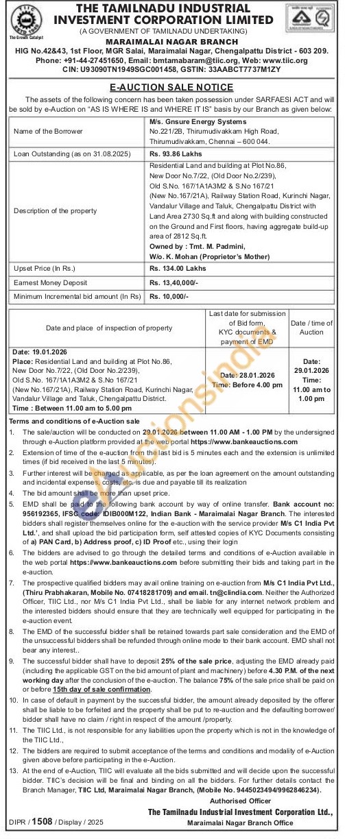 Residential Land and building at Plot No.86, New Door No.7/22, (Old Door No.2/239), Old S.No. 167/1A1A3M2 & S.No 167/21 (New No. 167/21A), Railway Station Road, Kurinchi Nagar, Vandalur Village and Taluk, Chengalpattu District with Land Area 2730 Sq.ft and along with building constructed on the Ground and First floors, having aggregate build-up area of 2812 Sq.ft.