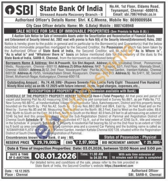 SCHEDULE OF THE PROPERTY PROPERTY HEREBY CONVEYED Item-1 (Total Property): All that piece and parcel of vacant plot bearing Plot No A3 measuring 3246 Sq.ft. and this plot comprised in Survey No.88/1, as per Patta No. 712, New Survey NO. 88/1C, at Irandamkattalai Village, Sriperumbudur Taluk, Kancheepuram, District and this property being bounded on the North by: Plot No A2, South by: Survey Nos.88/2,88/3 and 88/4, East by, 24 Feet Road and on the West by: Survey No.85 and 86. Measuring: East to West on the North: 86.3 Feet, East to West on the South sides: 69.6 Feet, North to South on the East: 34.9 Feet, North to South on the West: 40,9 feet+24 feet in all admeasuring an extent of 3246 Sq.leet And this property coming within the Sub-Registration District of Pammal and Registration District of Chennai South Schedule-'B' Property An un-divided 417 Sq.ft, out of the total extent of 3246 Sq.ft., title and interest in the Schedule Al property Schedule-C Property A residential Flat bearing No. S2 on the 2nd Floor to an extent of 1260 sq ft build up area construction including common area and a covered Car Parking and the building name is called as "AISWARYAM FLATS at Plot No A 3: Everest Garden, irandam Kattalai Chennai 600 128 situated within the Registration District of South Chennai and Sub-Registration of Pammal