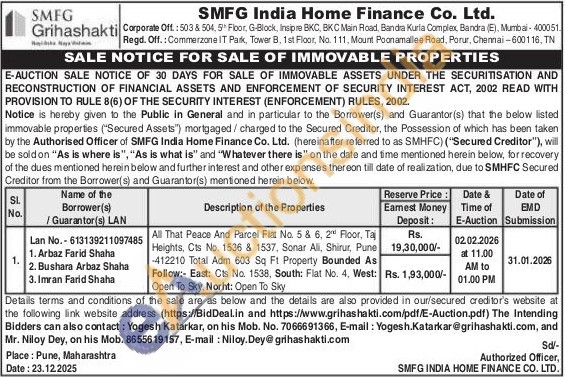 All That Peace And Parcel Flat No. 5 & 6, 2h Floor, Taj Heights, Cts No. 1536 & 1537, Sonar Ali, Shirur, Pune -412210 Total Adm 603 Sq Ft Property Bounded As Follow:- East: Cts No. 1538, South: Flat No. 4. West: Open To Sky, Norht: Open To Sky