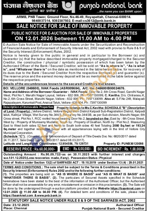 Property belongs to Ms.C. Kavitha: SCHEDULE "B" (Description of Land/Property): Vellore District, Vellore Registration District Katpadi Sub-Registration District, Katpadi taluk, Kalinjur Village, Wet Survey No.344/3, Re survey No.344/3B, as per Sub-division, Maruthi Nagar, 6th Cross street, Plot No. 1, RCC roofed house bearing Door No.2, bounded on the: East by: 6th Cross Street, West by: Property of Munisamy Mudaliar, South by: Property of Gsathan, North by: Plot No.2. Measuring East to West both sides 52 feet and North to South both sides 40 feet Totaling 2080 Sq.feet or 193.24 Sq.meter and together residential house with all appurtenances laying with in the limit of Vellore City Municipal Corporation.