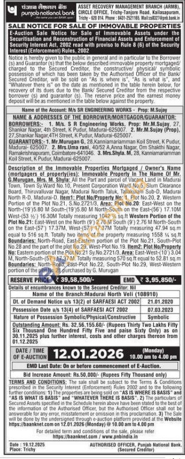 G.Murugan, Mrs. M. Shyla: All the Part and parcel of Vacant Land in Madurai Town, Town Sy. Ward No. 10, Present Corporation Ward No.5, Slum Clearance Board, Thiruvalluvar Nagar, Madurai North Taluk, Tallakulam Sub-D, Madurai North R-D, Madurai-D. Item1: Plot No/Property No: 1. Plot No.20, 2. Western Partion of the Plot No.21, S.No. 2721/3, Area: Plot No.20: East-West on the North-(19)5.80 M South-(19')5.80 M North-South on the East-(56') 17.10M West-(53) 16.30M Totally measuring 1042 % sq.ft Western Portion of the Plot No.21: East-West on the North (9) 2.76 M South (9) 2.76 M North-South on the East-(57) 17.37M, West-(57) 17.37M Totally measuring 47.94 sq.m equal to 516 sq.ft. Totally two items of the property measuring 1558 14 sq.ft Boundaries: North-Road, East-Eastern portion of the Plot No.21, South-Plot No.28 and the part of the plot No.29, West-Plot No. 19. Item2: Plot No/Property No: Eastern portion of the Plot No.21 Sy. No. 2721/3, Area: East-West-(10) 3.04 M, North-South-(57) 17.37 M. Totally measuring 570 sq.ft equal to 52.81 sq.m Boundaries: North-Road, East-Plot No.22, South-Plot No.29, West-Western portion of the plot No.21 purchased by G. Murugan