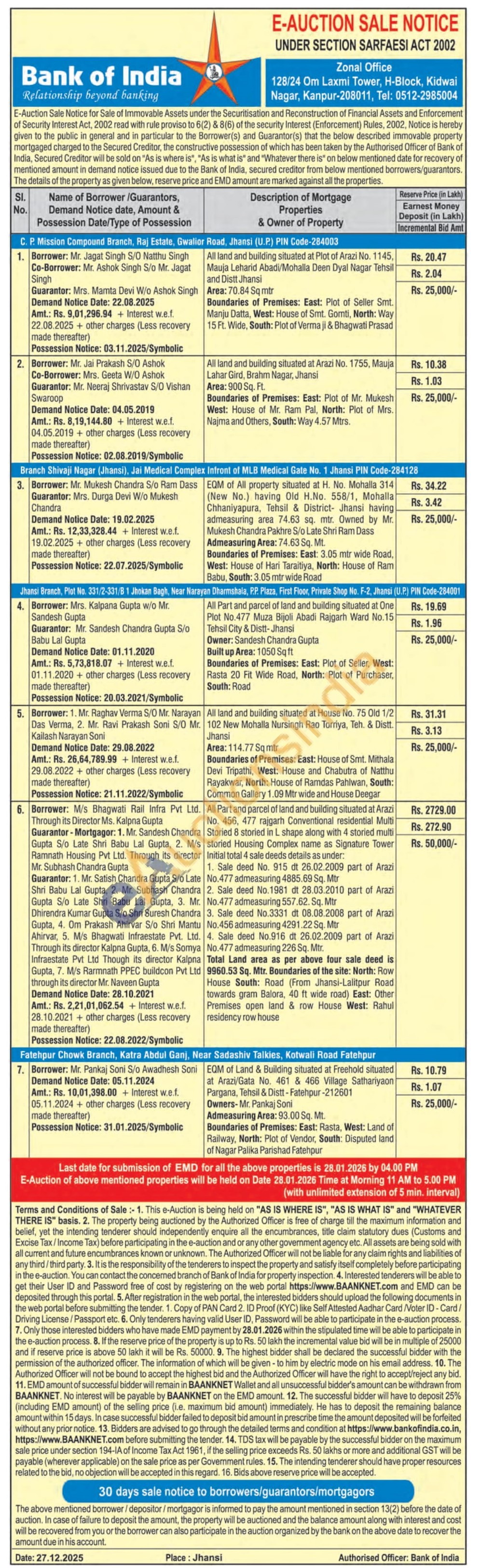 2) All land and building situated at Arazi No. 1755, Mauja Lahar Gird, Brahm Nagar, Jhansi Area: 900 Sq. Ft. Boundaries of Premises: East: Plot of Mr. Mukesh West: House of Mr. Ram Pal, North: Plot of Mrs. Najma and Others, South: Way 4.57 Mtrs