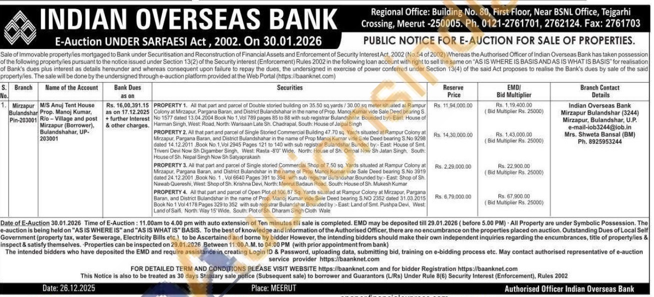 PROPERTY 3. All that part and parcel of Single storied Commercial Shop of 7.50 sq. Yards situated at Rampur Colony at Mirzapur, Pargana Baran, and District Bulandshar in the name of Prop Manoj Kumar vide Sale Deed bearing S.No 3919 dated 24.12.2001, Book No. 1, Vol 6640 Pages 391 to 394 with sub registrar Bulandshar. Bounded by:- East: Shop of Sh. Nawab Quereshi, West: Shop of Sh. Krishna Devi, North: Meerut Badaun Road, South: House of Sh. Mukesh Kumar