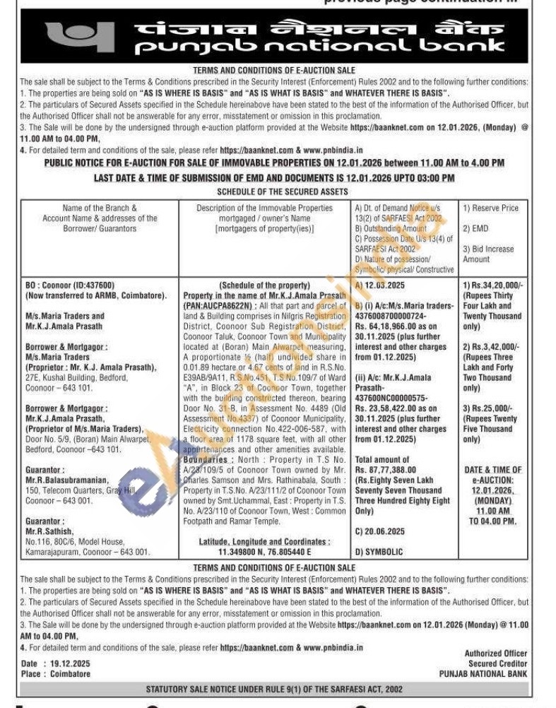 All that part and parcel of land & Building comprises in Nilgris Registration District, Coonoor Sub Registration District, Coonoor Taluk, Cooncor Town and Municipality located at (Boran) Main Alwarpet measuring, A proportionate½ (half) undivided share in 0.01.89 hectare or 4.67 cents of land in R.S.No. E39AB/9A11, R.S.No.451, T.S.No.109/7 of Ward "A", in Block 23 of Coonoor Town, together with the building constructed thereon, bearing Door No. 31-B, in Assessment No. 4489 (Old Assessment No.4337) of Coonoor Municipality, Electricity connection No.422-006-587, with a floor area of 1178 square feet, with all other appurtenances and other amenities available. Boundaries: North Property in T.S No. A/23/109/5 of Coonoor Town owned by Mr. Charles Samson and Mrs. Rathinabala, South Property in T.S.No. A/23/111/2 of Coonoor Town owned by Smt.Uchammal, East: Property in T.S. No. A/23/110 of Coonoor Town, West: Common Footpath and Ramar Temple