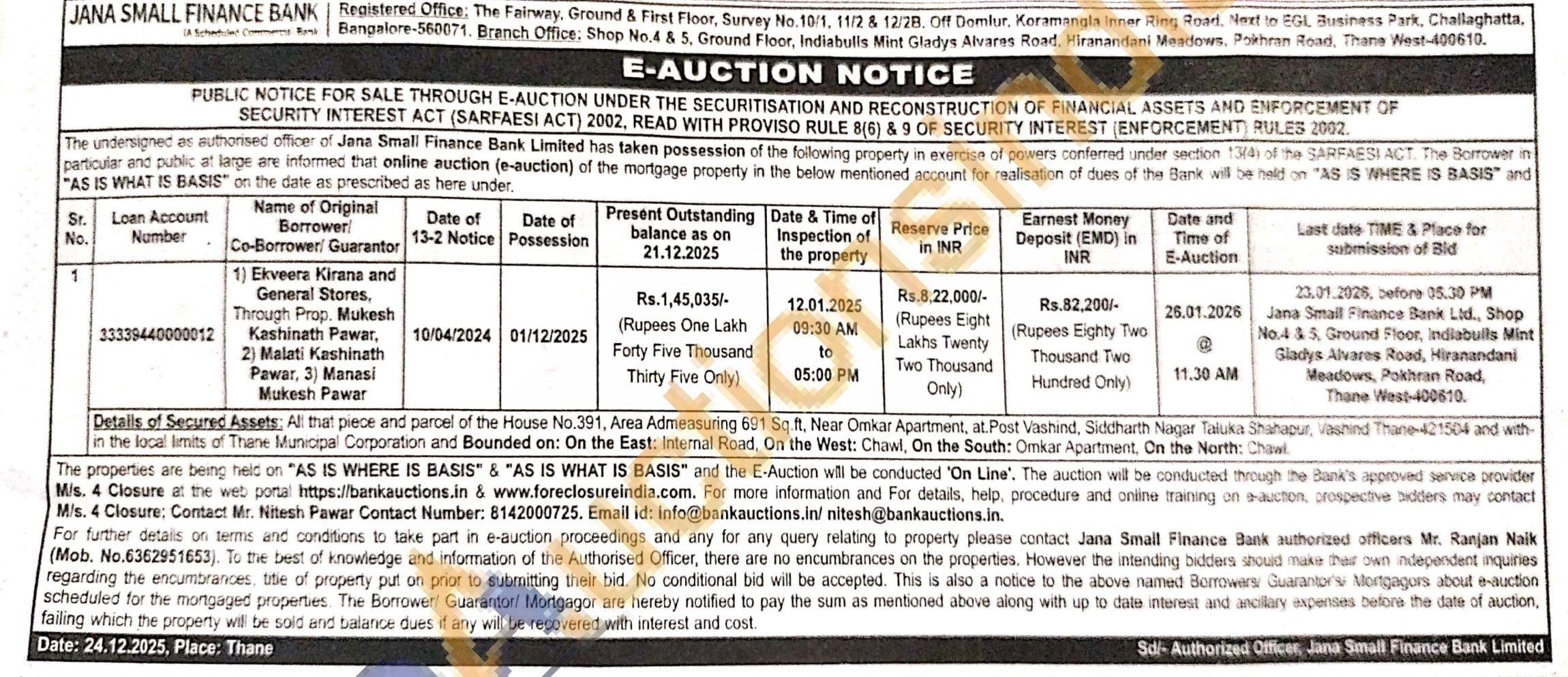 All that piece and parcel of the House No.391, Area Admeasuring 691 Sq.ft, Near Omkar Apartment, at. Post Vashind, Siddharth Nagar Taluka Shahapur, Vashind Thane-421504 and with in the local limits of Thane Municipal Corporation and Bounded on: On the East: Internal Road, On the West: Chawl, On the South: Omkar Apartment, On the North: Charat
