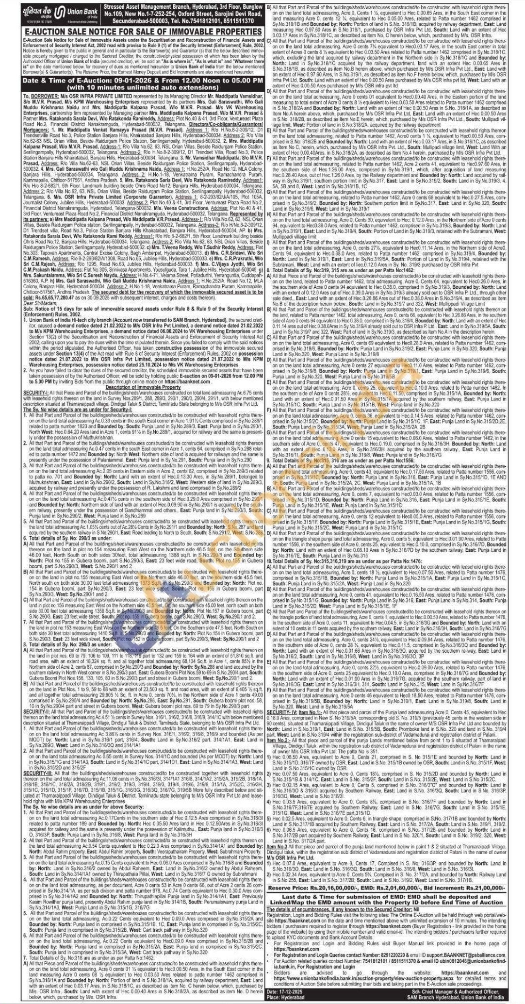 SECURITY-I: All that Piece and Parcel of the buildings/isheds/warehouses constructed on total land admeasuring Ac.6.75 cents with leasehold rights thereon on the land in Survey Nos 289/1 288, 289/3, 290/1, 290/3, 290/4, 291/1, with below mentioned description situated at Thamaraippadi village. Dindigul Taluk & District, Tamilnadu State belonging to Mis OSR Infra Pvt Ltd. The Sy. No wise details are as under for Security-l 1. All that Part and Parcel of the buildings/sheds/warehouses constructed to be constructed with leasehold rights there on on the land total admeasuring Ac.0.33 cents in the south East comer in Acre 1.91% Cents comprised in Sy No.289/1 related to patta number 1823 and Bounded by: South: Punja Land in Sy No.289/3, East: Punja land in Sy No.290/1, North West: Hec 0.64.20 Ares land in Acre 1, cents 91% in Sy. No.289/1, acquired for railway and the same is present-ly under the possession of Muthukrishnan. 2. All that Part and Parcel of the buildings/sheds/warehouses constructed/to be constructed with leasehold rights thereon on the land total admeasuring Ac.0.47 cents in the south East comer in Acre 1, cents 64, comprised in Sy No.288 relat-ed to patta number 1472 and Bounded by: North West: Northern side of land is acquired for railways and the same is presently under the possession of Palaniammal, East: Punja land in Sy.No.291, South: Punja land in Sy No.290 3. All that Part and Parcel of the buildings/sheds/warehouses constructed to be constructed with leasehold rights there-on on the land total admeasuring Ac.2.05 cents in Eastern side in Acre 2, cents 62, comprised in Sy.No.289/3 related to patta no. 701 and Bounded by: North: Land with an extent of Hec.0.13.30 Ares, in Sy No.289/1, belonged to Muthukrishnan, East: Land in Sy No. 290/2, South: Land in Sy.No.316/2, West: Western side of land in Sy.No. 289/3, acquired by railway and presently under the possession of R. Lakshmi and land comprised in Sy.No.289/2 4. All that Part and Parcel of the buildings/sheds/warehouses constructedito be constructed with leasehold rights there-on on the land total admeasuring Ac.0.47% cents in the southern side of Hec.0.29.0 Ares comprised in Sy.No.290/1 and Bounded by: North: Northern side of land with an extent of Hec.0.09.90 in Sy.No.290/1 is acquired by the south-en railway, presently under the possession of Gandhiammal and others., East: Punja land in Sy. No.290/3, South: Punja land in Sy No. 290/2, West: Punja land in Sy No.289 5. All that Part and Parcel of the buildings/sheds/warehouses constructed to be constructed with leasehold rights thereon on the land total admeasuring Ac. 1.05% cants out of Ac.2814 Cents in Sy. No.291/1 and Bounded by: North: S.No.287 and land acquired by the southem railway in S.No.290/1, East: Road leading to North to South, South: S.No.291/2, West: S.No.288 6. Total details of Sy. No: 290/3 as under: A) All that Part and Parcel of the buildings/sheds/warehouses constructed to be constructed with leasehold rights thereon on the land in plot no.154 measuring East West on the Northern side 46.5 feet, on the Southern side 46.00 feet, North South on both sides 30feet, total admeasuring 1388 sq.ft. in S.No.290/3 and Bounded by: North: Plot no. 155 in Gubera boomi, part S.No. 290/3, East: 23 feet wide road, South: Plot no. 155 in Gubera boomi, part S.No. 290/3, West: S.No.290/1 and 2