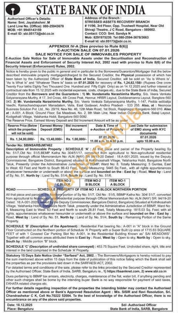 SCHEDULE 'A': All that piece and parcel of the Property bearing Sy No: 51/7,Old No. 51/5, BEMP Katha No 304/51/17, converted from agricultural to Non-agricultural residential purpose through official Memorandum No: ALN (NAY) SR 94/19-20 Dated: 18 A-001.2020, issued by the Deputy Commissioner, Bangalore District, Bangalore) situated at Kothihosahalli Village, Yelahanka Hobli, Bangalore North Taluk, Presently Under the Administrative Jurisdiction of BBMP, Ward No. B. Totally Measuring: 5 Guntas, East to West: 63 Feet and North to South 86.43 Feet, Totally Measuring: 5445 Sq Feet., with all rights appurtenances whatsoever hereunder or underneath or above the surface and bounded on the East by: Road, West by: Land of Sy. No. 51, North by: Land Sy. No. 51/4, South by: Land Sy. No. 51/6.
