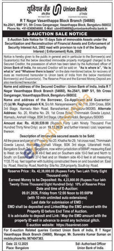 All the piece and parcel of Property No 20. Khatha No 29, 1st cross road, Thimmaiah Gowda Layout, Ittamadu, Arehalli Village, BSK 3rd stage, Uttarahalli Hobli, Bangalore South Taluk, Bangalore, now within jurisdiction of BBMP, measuring East to West: on Northern side 49-0 feet and on Southem side 10-0 feet and North to South: on Eastern side 37-0 feet and on Western side 40-0 feet in all measuring 1135.75 sq. feet together with building constructed there on and bounded on: East by: Road, West by: Road, North by. Site No. 20A property, South by: Road.
