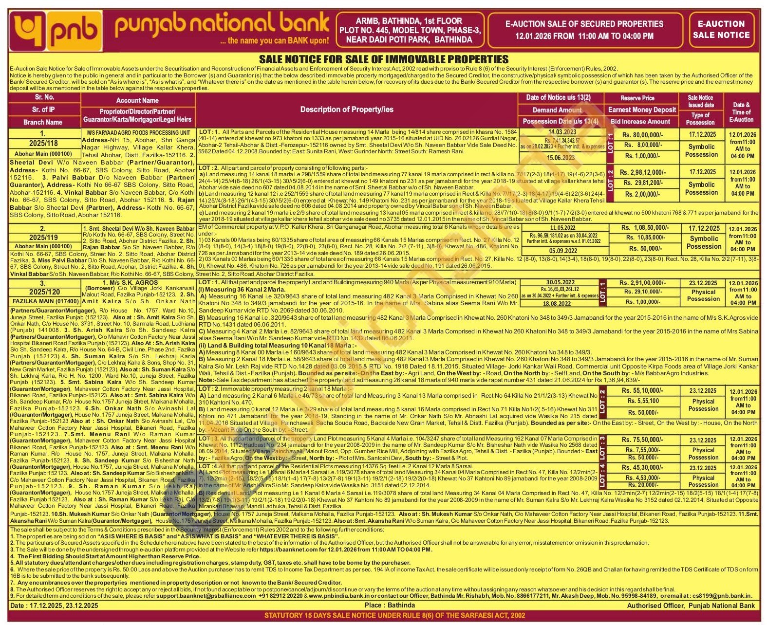EM of Commercial property at V.PO. Kalier Khera, Sri Ganganagar Road, Abohar measuring total 6 Kanals whose details are asunder-1)03 Kanals 00 Marlas being 60/1335 share of total area of measuring 66 Kanals 15 Marlas comprised in Rect. No. 27 Killa No. 12 (8-0) 13(8-0), 14(3-4) 18(8-0) 19(8-0), 22(8-0), 23(8-0), Rect. No. 28, Killa No. 2/2 (7-11), 3(8-0), Khewat No. 486, Khatoni No. et 726 as per Jamabandi for the year 2013-14 vide sale deed No. 189 dated 26.06.2015.2) 03 Kanals 00 Marlas being 60/1335 share of total area of measuring 66 Kanals 15 Marias comprised in Rect. No. 27, Killa No. 12 0), Khewat No. 486, Khatoni No. 726 as per Jamabandi for the year 2013-14 vide sale deed No. 191 dated 26.06.2015.