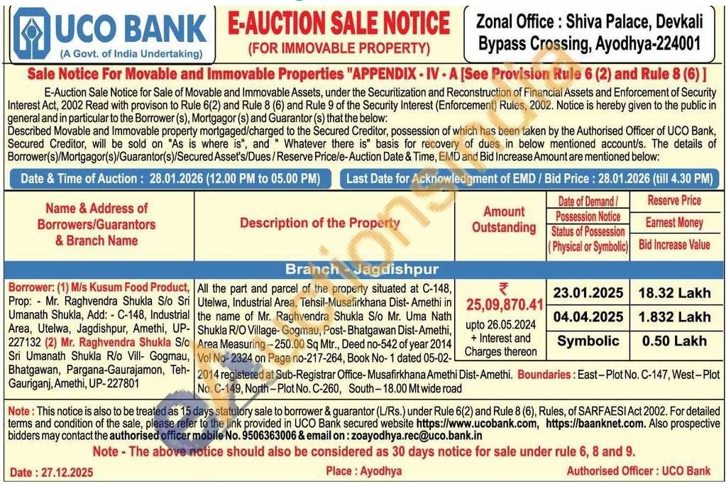 All the part and parcel of the property situated at C-148, Utelwa, Industrial Area, Tehsil-Musafirkhana Dist-Amethi in the name of Mr. Raghvendra Shukla S/o Mr. Uma Nath Shukla R/O Village-Gogmau, Post-Bhatgawan Dist-Amethi, Area Measuring-250.00 Sq Mtr., Deed no-542 of year 2014 Vol No-2324 on Page no-217-264, Book No-1 dated 05-02- 2014 registered at Sub-Registrar Office-Musafirkhana Amethi Dist-Amethi. Boundaries: East-Plot No. C-147, West-Plot No. C-149, North-Plot No. C-260, South-18.00 Mt wide road
