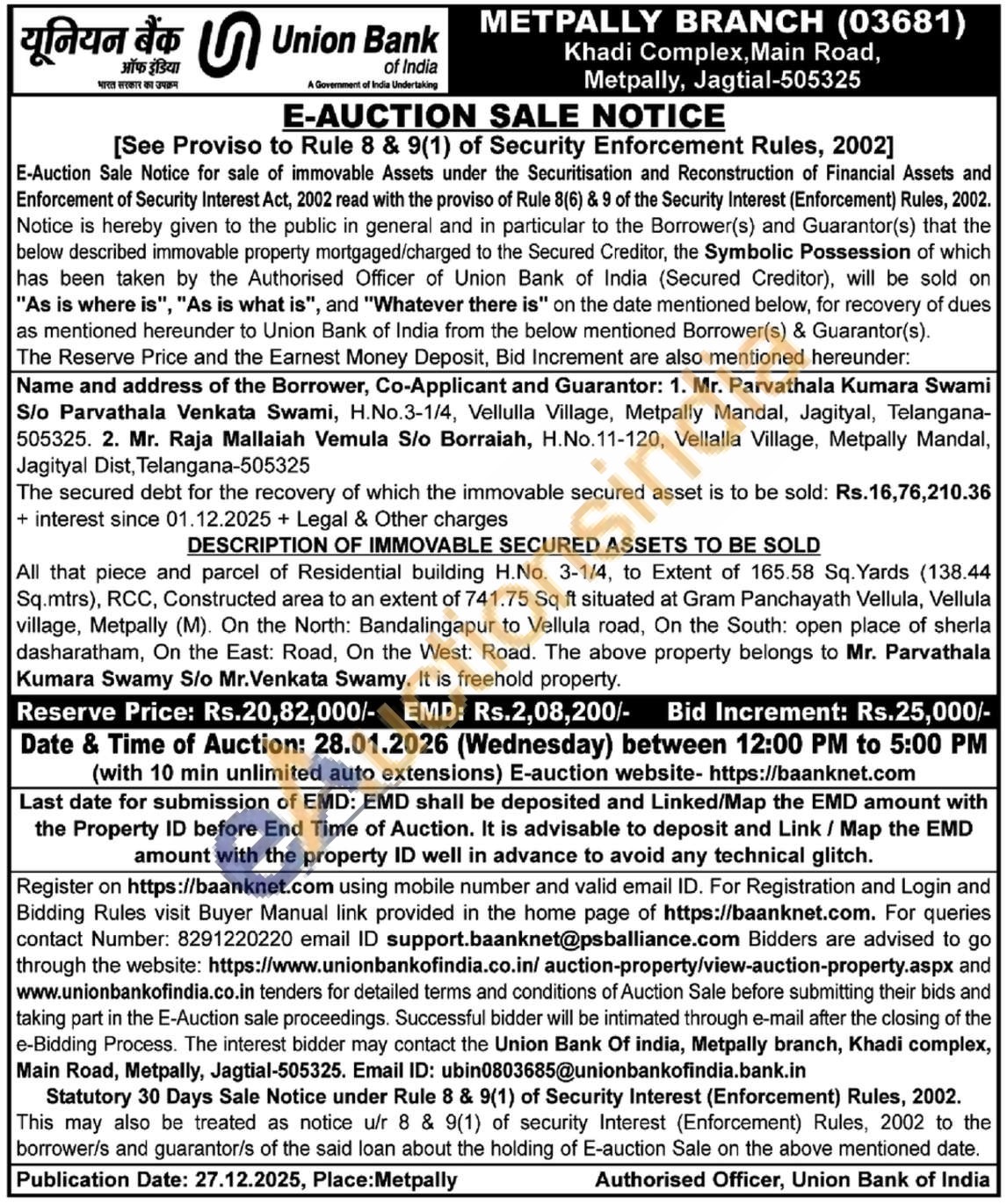 DESCRIPTION OF IMMOVABLE SECURED ASSETS TO BE SOLD : All that piece and parcel of Residential building H.No. 3-1/4, to Extent of 165.58 Sq. Yards (138.44 Sq.mtrs), RCC, Constructed area to an extent of 741.75 Sq ft situated at Gram Panchayath Vellula, Vellula village, Metpally (M). On the North: Bandalingapur to Vellula road, On the South: open place of sherla dasharatham, On the East: Road, On the West: Road. The above property belongs to Mr. Parvathala Kumara Swamy S/o Mr.Venkata Swamy. It is freehold property