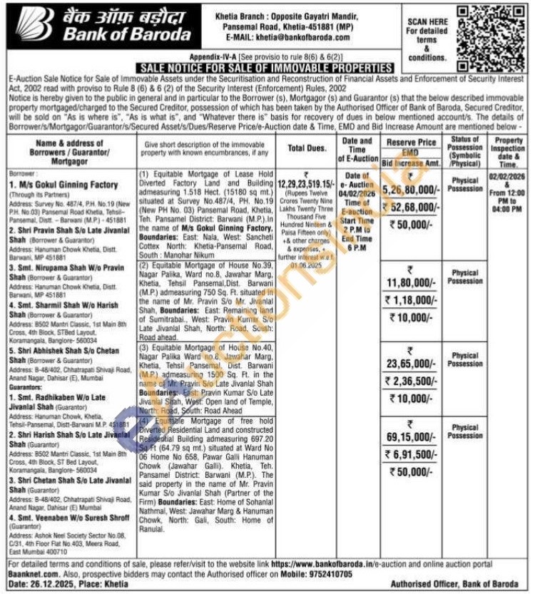 (4) Equitable Mortgage of free hold Diverted Residential Land and constructed Residential Building admeasuring 697.20 Sq Ft (64.79 sq mt.) situated at Ward No 06 Home No 658, Pawar Galli Hanuman Chowk (Jawahar Galli). Khetia, Teh. Pansamel District: Barwani (M.P.). The said property in the name of Mr. Pravin Kumar S/o Jivanlal Shah (Partner of the Firm) Boundaries: East: Home of Sohanlal Nathmal, West Jawahar Marg & Hanuman Chowk, North: Gali, South: Home of Ranulal