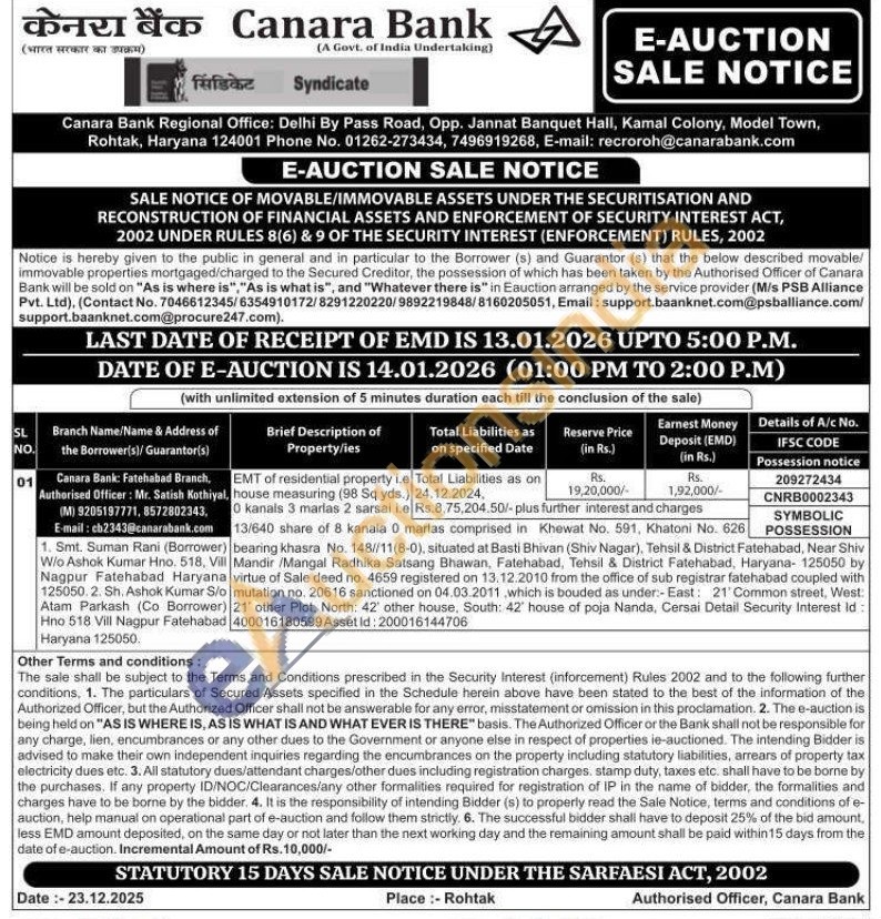 EMT of residential property i.e house measuring (98 Sq yds.) 0 kanals 3 marlas 2 sarsai ie 13/640 share of 8 kanala 0 marlas comprised in Khewat No. 591, Khatoni No. 626 ) bearing khasra No. 148//11(8-0), situated at Basti Bhivan (Shiv Nagar), Tehsil & District Fatehabad, Near Shiv Vill Mandir /Mangal Radhika Satsang Bhawan, Fatehabad, Tehsil & District Fatehabad, Haryana- 125050 by virtue of Sale deed no. 4659 registered on 13.12.2010 from the office of sub registrar fatehabad coupled with o mutation no. 20616 sanctioned on 04.03.2011, which is bouded as under-East: 21° Common street, West: ) 21' other Plot, North: 42' other house, South: 42' house of poja Nanda, Cersai Detail Security Interest Id: 400016180599 Asset Id: 200016144706