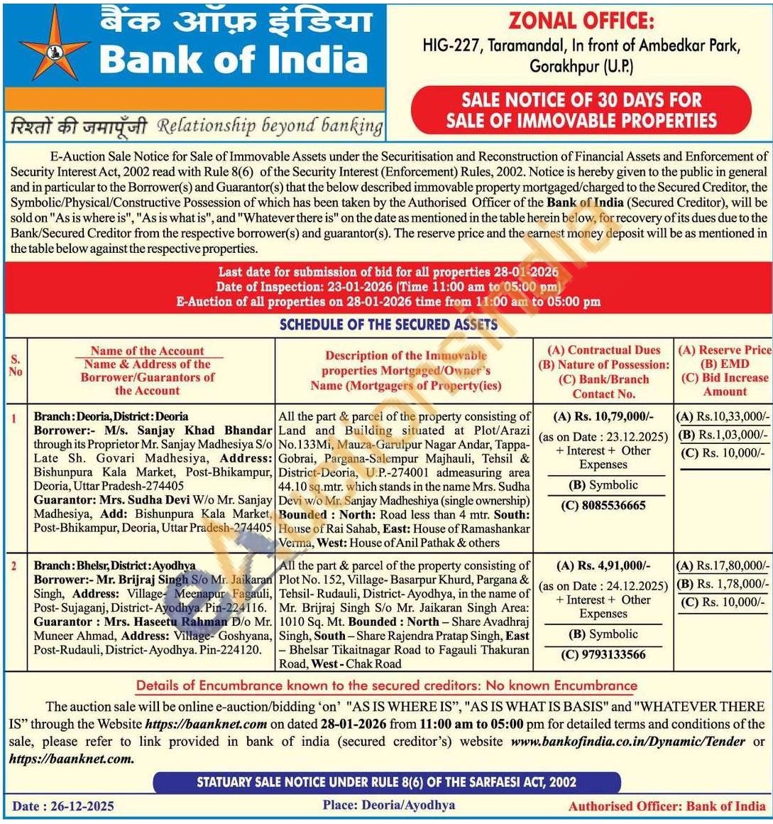 All the part & parcel of the property consisting of Plot No. 152, Village-Basarpur Khurd, Pargana & Tehsil- Rudauli, District- Ayodhya, in the name of Mr. Brijraj Singh S/o Mr. Jaikaran Singh Area: 1010 Sq. Mt. Bounded: North-Share Avadhraj Singh, South- Share Rajendra Pratap Singh, East - Bhelsar Tikaitnagar Road to Fagauli Thakuran Road, West-Chak Road