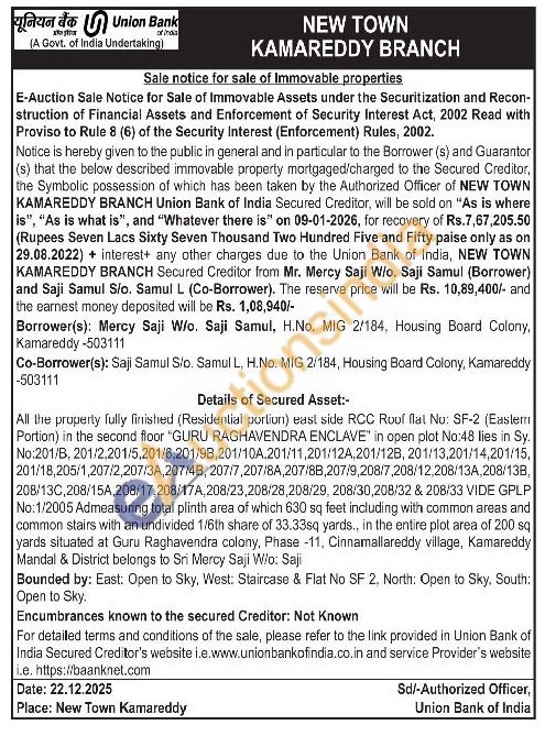 All the property fully finished (Residential portion) east side RCC Roof flat No: SF-2 (Easlem Portion) in the second floor "GURU RAGHAVENDRA ENCLAVE" in open plot No:48 lies in Sy. No:201/B, 201/2,201/5,201/6,201/98,201/10A.201/11,201/12A,201/128, 201/13,201/14,201/15, 201/18,205/1,207/2,207/3A, 207/48, 207/7,207/8A,207/88,207/9,208/7,208/12,208/13A,208/138, 208/130,208/15A,208/17,208/17A,208/23,208/28,208/29, 208/30,208/32 & 208/33 VIDE GPLP No:1/2005 Admeasuring total plinth area of which 630 sq feet including with common areas and common stairs with an undivided 1/6th share of 33.33sq yards., in the entire plot area of 200 sq yards situated at Guru Raghavendra colony, Phase -11, Cinnamallareddy village, Kamareddy Mandal & District belongs to Sri Mercy Saji W/o: Saji Bounded by: East: Open to Sky, West. Staircase & Flat No SF 2, North: Open to Sky, South: Open to Sky.