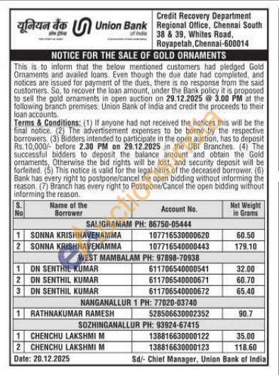 Union Bank of India Gold Auctions Auction in Chennai