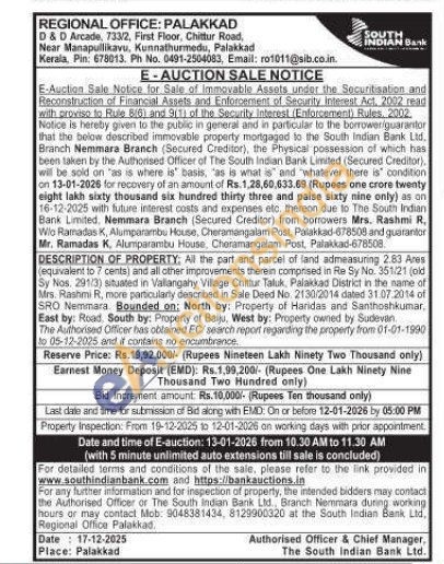 All the part and parcel of land admeasuring 2.83 Ares equivalent to ? cents) and all other improvements therein comprised in Re Sy No. 351/21 (old Sy Nos. 291/3) situated in Vallangahy Village Chittur Taluk, Palakkad District in the name of Mrs. Rashmi R, more particularly described in Sale Deed No. 2130/2014 dated 31.07.2014 of SRO Nemmara Bounded on: North by: Property of Haridas and Santhoshkumar, East by: Road, South by: Property of Baiju, West by: Property owned by Sudevan The Authorised Officer has obtained EC/search report regarding the property from 01-01-1990 to 05-12-2025 and it contains no encumbrance