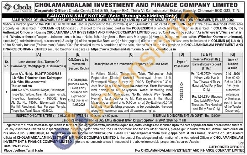 In Vellore District, Thirupathur Taluk, Thirupathur Sub Registration District, Kandhili Panchayat Union Limit, Elavampatti Village Survey No. 190/9B, Dry.Ext. Hec.0.30.0, Asst Rs.2.78 out of this land Bounded by:- East: Remaning land belongs to Mr. Kaliyappan, West: Remaining land belongs to Mr. Kaliyappan, North: Vehicle Way, South: Remaing land belongs to Mr. Kaliyappan, In the Midst Measuring an extent of Ac 0.10 cents (or) Dry.Ext. Hect.0.04.0 land with Acc Building proposed to be constructed thereon along with common way and all easement rights.