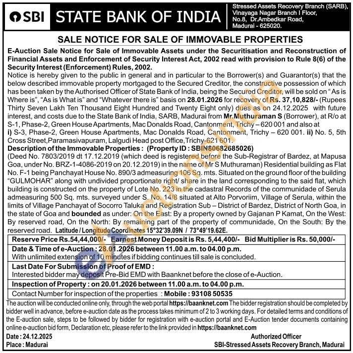 Description of the Immovable Properties: (Property ID: SBIN80682685026) : (Deed No. 7803/2019 dt 17.12.2019 (which deed is registered before the Sub-Registrar of Bardez, at Mapusa Goa, under No. BRZ-1-4086-2019 on 20.12.2019) in the name of Mr S Muthuraman) Residential building as Flat No. F-1 being Panchayat House No. 890/3 admeasuring 106 Sq. mts. Situated on the ground floor of the building "GULMOHAR" along with undivided proportionate right/ share in the land corresponding to the said flat, which building is constructed on the property of Lote No. 223 in the cadastral Records of the communidade of Serula admeasuring 500 Sq. mts. surveyed under S. No. 14/8 situated at Alto Porvoriim, Village of Serula, within the limits of Village Panchayat of Socorro Taluka and Registration Sub - District of Bardez, District of North Goa, in the state of Goa and bounded as under: On the East: By a property owned by Gajanan P Kamat, On the West: By reserved road, On the North: By remaining part of the property of communidade, On the South: By the reserved road. Latitude/Longitude Coordinates 15°32'39.09N / 73°49′19.62E