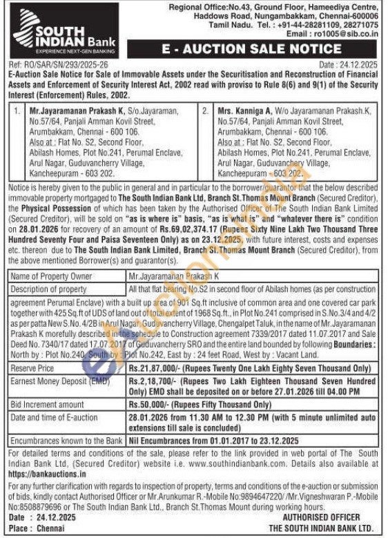 Authorised Officer or Mr. Arunkumar R.-Mobile No : 9894647220 / Mr.Vigneshwaran P.-Mobile No : 8508879696