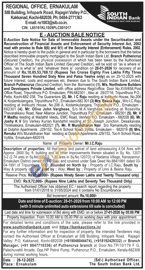 Description of properties: All that piece and parcel of land admeasuring 4.04 Ares with Approx. 2600 Sq. ft. building and all other improvements therein situated in Sy. No. 1207/3-2 (2.74 ares in Sy.No.1207/3, 1.30 ares in Sy.No.1207/2) of Nadama Village, Kanayannur, Ernakulam District owned by I C Raju and covered under Sale Deed No.884/1991 dated 03-04-1991 of Tripunithura SRO. Bounded on North by: Property of I.C.Raju, South by: Way & property of Unni, East by: Way; West by: Property of Unni & Beena Raju