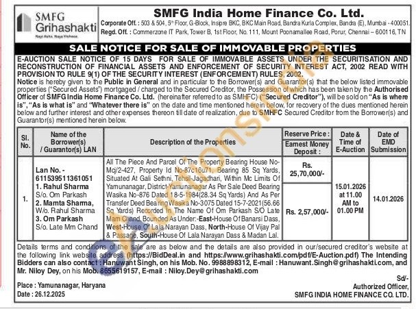 All The Piece And Parcel Of The Property Bearing House No-Maj/2-427, Property Id No-87c16u71, Bearing 85 Sq Yards, Situated At Galli Sethni, Tehsil-Jagadhari, Within Mc Limits Of Yamunanagar, District-Yamunanagar As Per Sale Deed Bearing Wasika No-876 Dated 18-5-1984(28.34 Sq Yards) And As Per Transfer Deed Bearing Wasika No-3075 Dated 15-7-2021 (56.66 Sq Yards) Recorded In The Name Of Om Parkash S/O Late Mam Chand. Bounded As Under: -East-House Of Banarsi Dass, West-House Of Lala Narayan Dass, North-House Of Vijay Pal & Passage, South-House Of Lala Narayan Dass & Madan Lal.