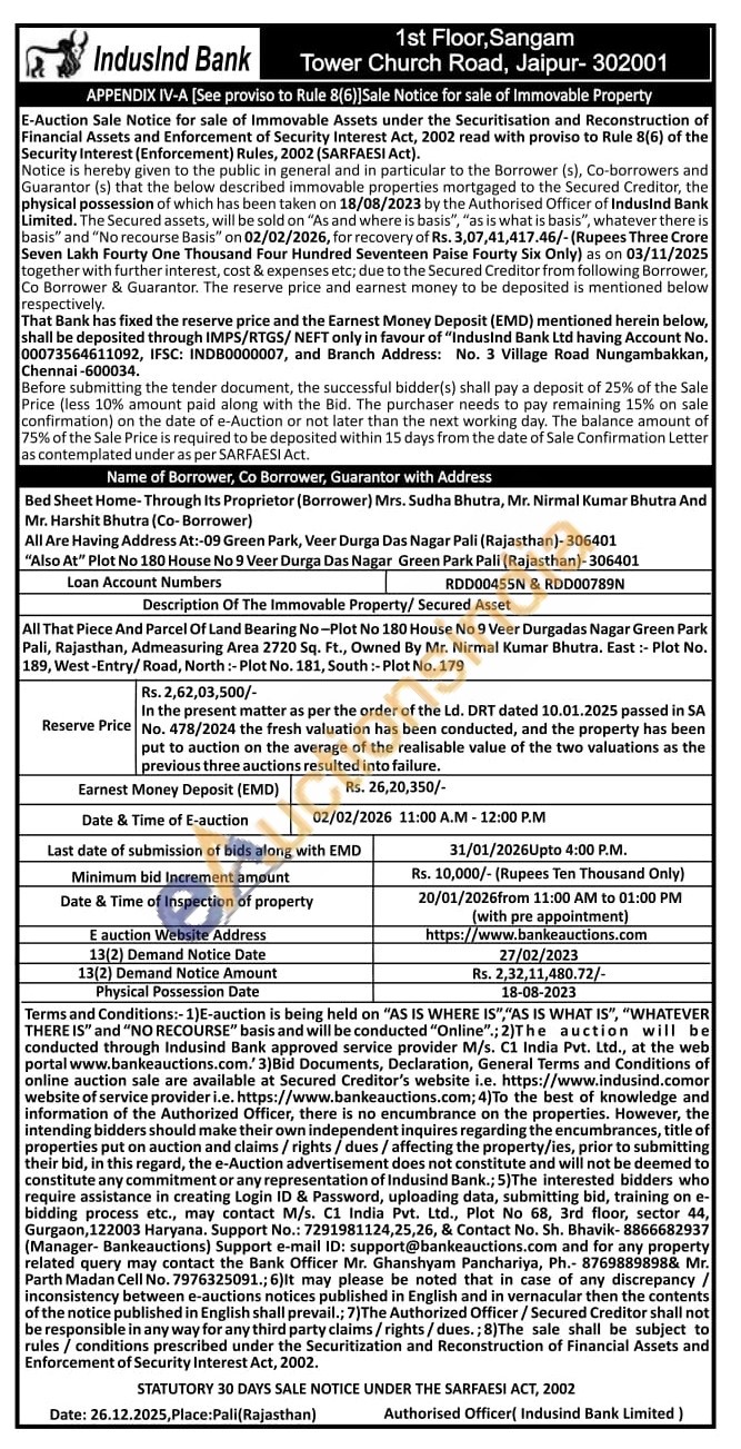 All That Piece And Parcel Of Land Bearing No-Plot No 180 House No 9 Veer Durgadas Nagar Green Park Pali, Rajasthan, Admeasuring Area 2720 Sq. Ft., Owned By Mr. Nirmal Kumar Bhutra. East:- Plot No. 189, West-Entry/Road, North: Plot No. 181, South: Plot No. 179