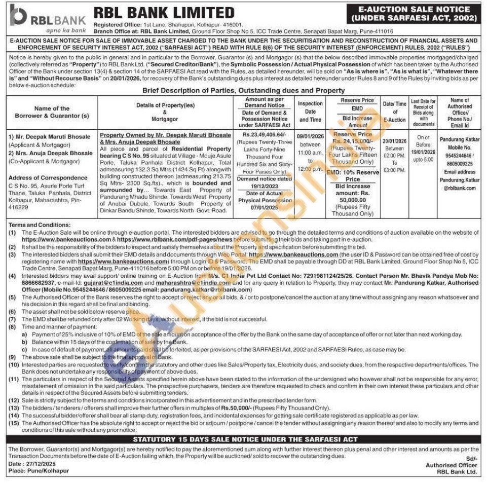 All piece and parcel of Residential Property bearing CS No. 95 situated at Village-Mouje Asule Porle, Taluka Panhala District Kolhapur, Total admeasuring 132.3 Sq Mtrs (1424 Sq Ft) alongwith building constructed thereon (admeasuring 213.75 Sq Mtrs- 2300 Sq.fts)., which is bounded and surrounded by... Towards East Property of Pandurang Mhadu Shinde, Towards West Property of Anubai Dubule, Towards South Property of Dinkar Bandu Shinde, Towards North Govt. Road.