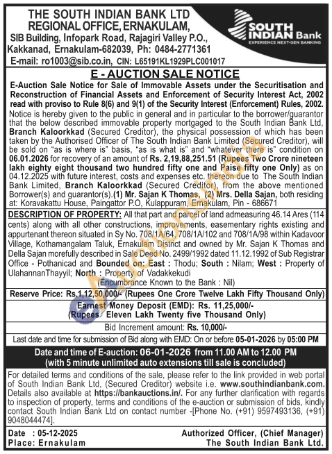 All that part and parcel of land admeasuring 46.14 Ares (114) cents) along with all other constructions, improvements, easementary rights existing and appurtenant thereon situated in Sy No. 708/1A/64, 708/1A/102 and 708/1A/98 within Kadavoor Village, Kothamangalam Taluk, Ernakulam District and owned by Mr. Sajan K Thomas and Della Sajan morefully described in Sale Deed No. 2499/1992 dated 11.12.1992 of Sub Registrar Office Pothanicad and Bounded on: East: Thodu; South: Nilam; West: Property of Ulahannan Thayyil; North: Property of Vadakkekudi