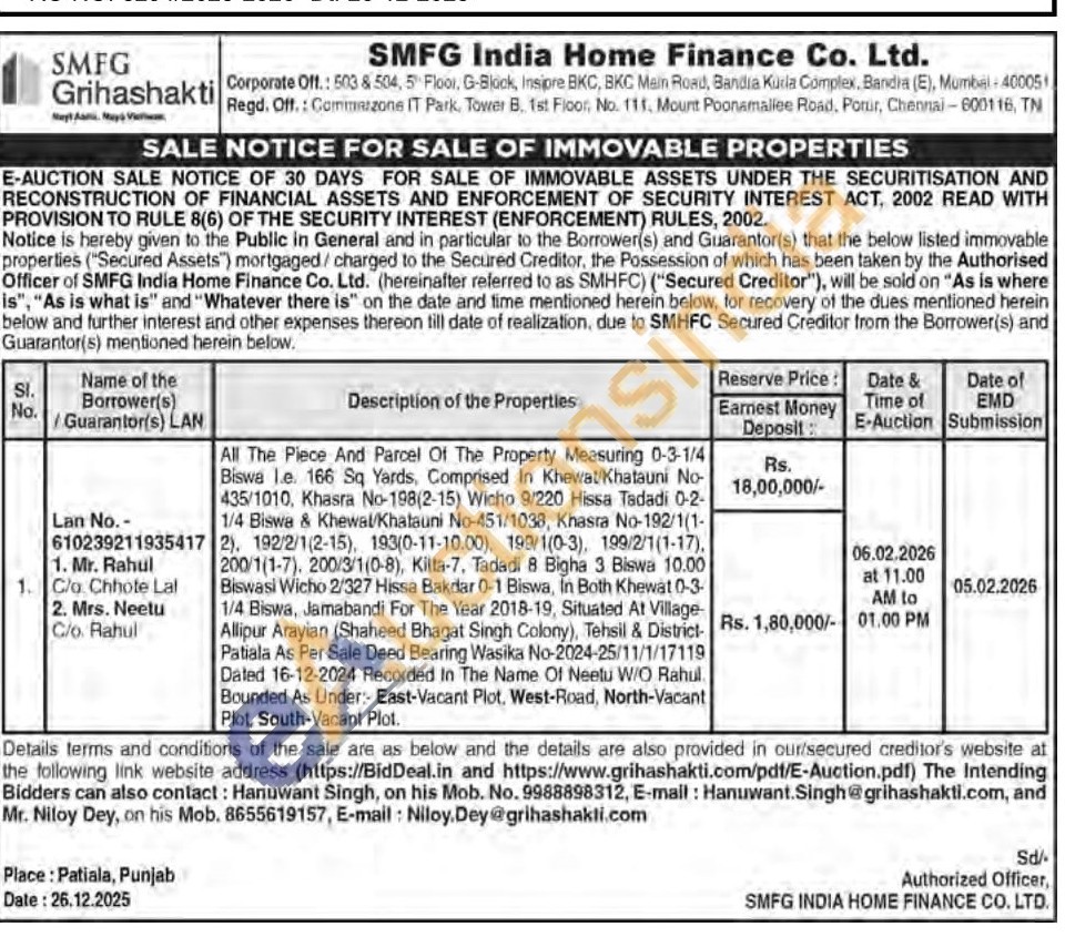 All The Piece And Parcel Of The Property Measuring 0-3-1/4 Biswa le. 166 Sq Yards, Comprised In Khewat/Khatauni No-435/1010, Khasra No-198(2-15) Wicho 9/220 Hissa Tadadi 0-2-1/4 Biswa & Khewat/Khatauni No-451/1038, Khasra No-192/1(1-2), 192/2/1(2-15), 193(0-11-10.00), 199/1(0-3), 199/2/1(1-17), 200/1(1-7), 200/3/1(0-8), Kitta-7, Tadadi 8 Bigha 3 Biswa 10.00 Biswasi Wicho 2/327 Hissa Bakdar 0-1 Biswa, In Both Khewat 0-3-1/4 Biswa, Jamabandi For The Year 2018-19, Situated At Village Allipur Arayian (Shaheed Bhagat Singh Colony), Tehsil & District-Patiala As Per Sale Deed Bearing Wasika No-2024-25/11/1/17119 Dated 16-12-2024 Recorded In The Name Of Neetu W/O Rahul. Bounded As Under:- East-Vacant Plot, West-Road, North-Vacant Plot, South-Vacant Plot.