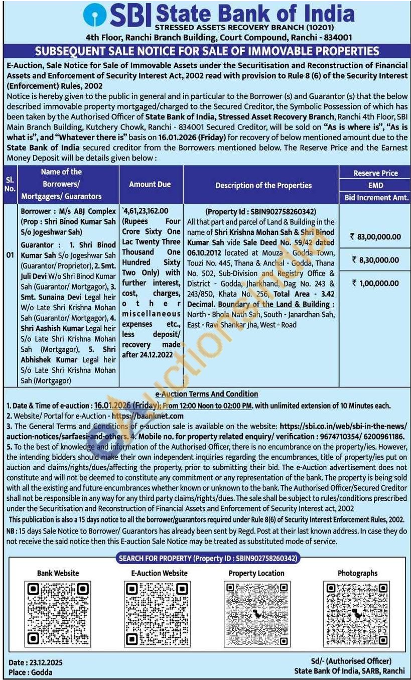 All that part and parcel of Land & Building in the name of Shri Krishna Mohan Sah & Shri Binod Kumar Sah vide Sale Deed No. 59/42 dated 06.10.2012 located at Mouza - Godda Town, Touzi No. 445, Thana & Anchal - Godda, Thana No. 502, Sub-Division and Registry Office & District Godda, Jharkhand, Dag No. 243 & 243/850, Khata No. 256, Total Area 3.42 Decimal. Boundary of the Land & Building: North Bhola Nath Sah, South - Janardhan Sah, East-Ravi Shankar Jha, West - Road