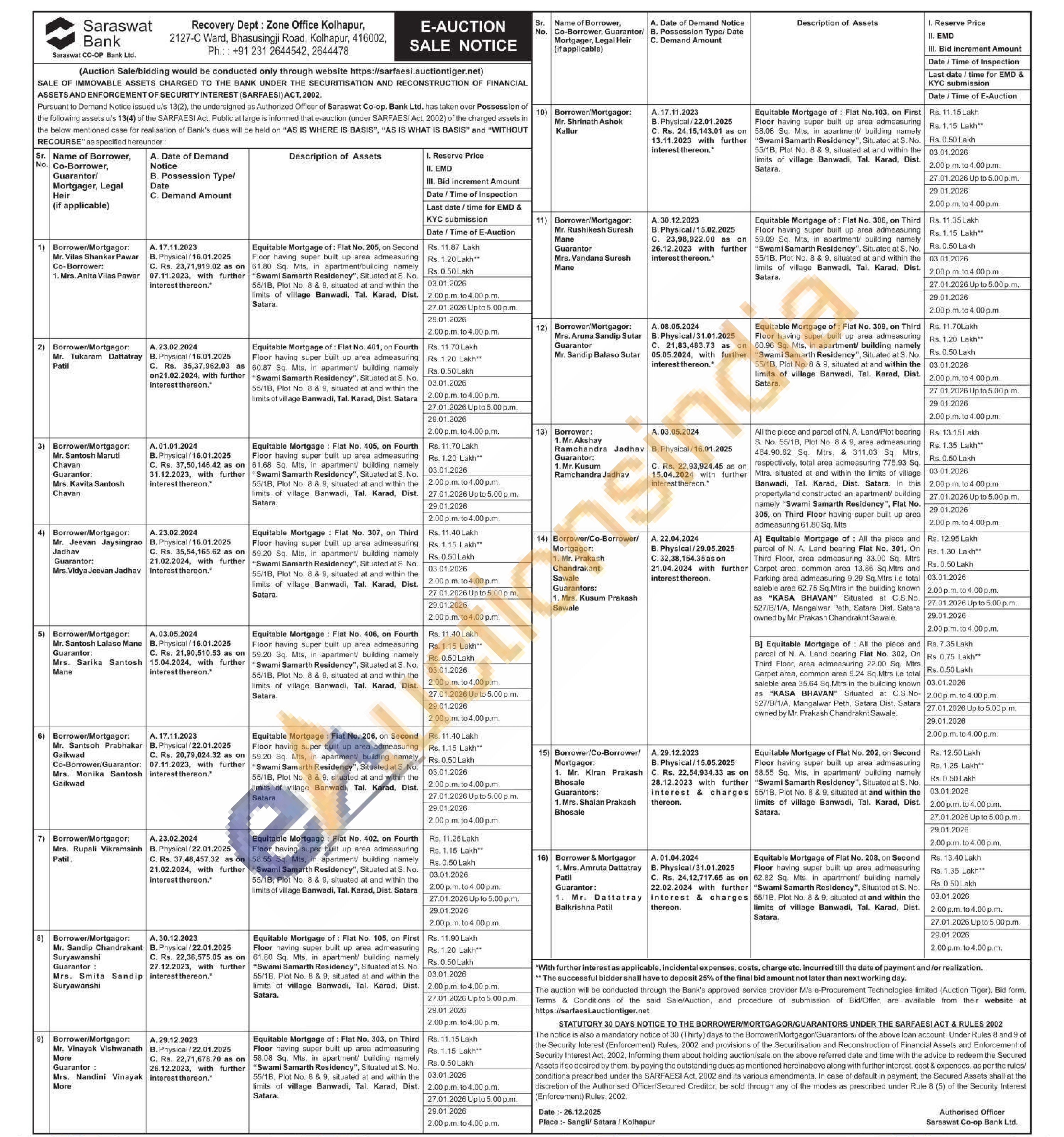 B] Equitable Mortgage of All the piece and parcel of N. A. Land bearing Flat No. 302, On Third Floor, area admeasuring 22.00 Sq. Mtrs Carpet area, common area 9.24 Sq.Mtrs ie total saleble area 35.64 Sq.Mtrs in the building known as "KASA BHAVAN" Situated at C.S.No-527/B/1/A, Mangalwar Peth, Satara Dist. Satara owned by Mr. Prakash Chandraknt Sawale.