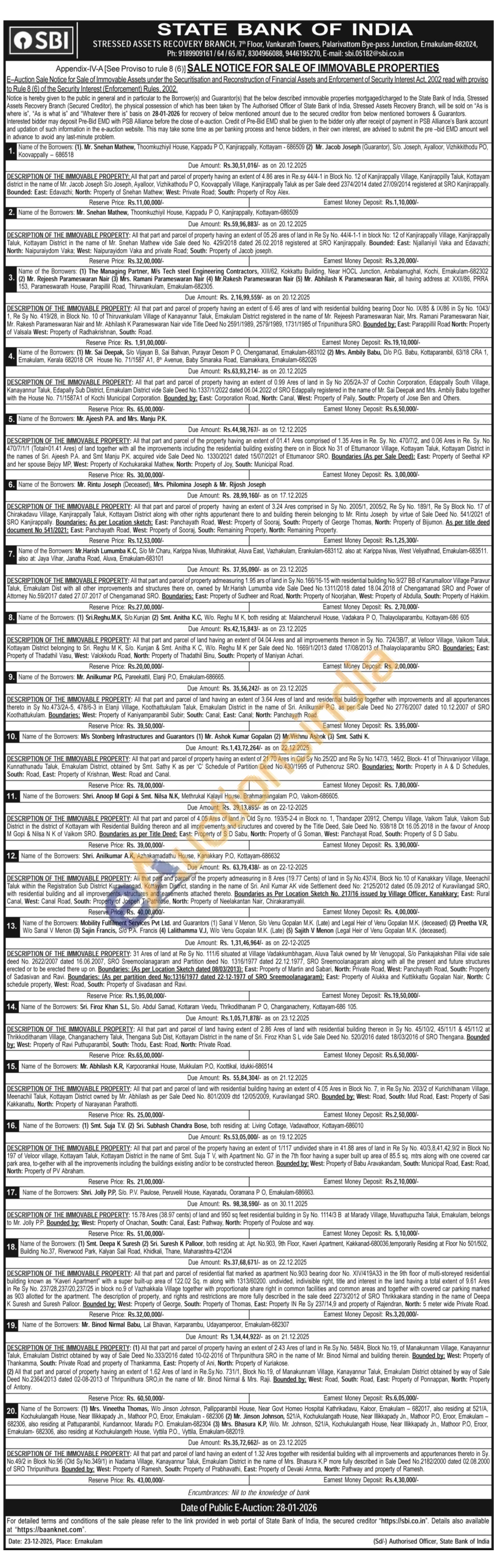 DESCRIPTION OF THE IMMOVABLE PROPERTY: (1) All that part and parcel of property having an extent of 2.43 Ares of land in Re.Sy.No. 548/4, Block No. 19, of Manakunnam Village, Kanayannur Taluk, Ernakulam District obtained by way of Sale Deed No.333/2016 dated 10-02-2016 of Thripunithura SRO in the name of Mr. Binod Nirmal and building therein. Bounded by: West: Property of Thankamma, South: Private Road and property of Thankamma, East: Property of Ani, North: Property of Kuriakose. (2) All that part and parcel of property having an extent of 1.62 Ares of land in Re.Sy.No. 731/1, Block No. 19, of Manakunnam Village, Kanayannur Taluk, Ernakulam District obtained by way of Sale Deed No.2364/2013 dated 02-08-2013 of Thripunithura SRO,in the name of Mr. Binod Nirmal & Mrs. Raji. Bounded by: West: Road, South: Road, East: Property of Ponnappan, North: Property of Antony.