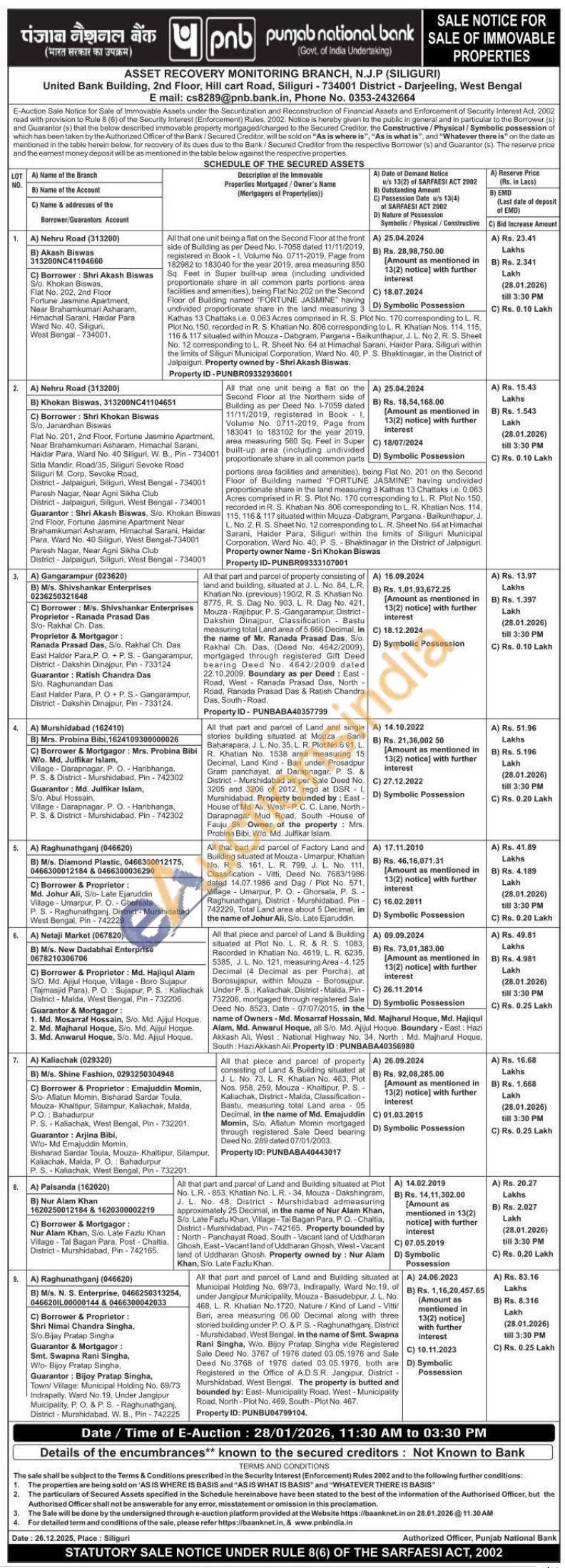 All that one unit being a flat on the Second Floor at the front side of Building as per Deed No. 1-7058 dated 11/11/2019. registered in Book -1, Volume No. 0711-2019, Page from 182982 to 183040 for the year 2019, area measuring 850 Sq. Feet in Super built-up area (including undivided proportionate share in all common parts portions area facilities and amenities), being Flat No.202 on the Second Floor of Building named 'FORTUNE JASMINE" having undivided proportionate share in the land measuring 3 Kathas 13 Chattaks i.e. 0.063 Acres comprised in R. S. Plot No. 170 corresponding to L. R. Plot No. 150, recorded in R. S. Khatian No. 806 corresponding to L.. R. Khatian Nos. 114, 115, 116 & 117 situated within Mouza-Dabgram, Pargana-Baikunthapur, J. L. No 2, R. S. Sheet No. 12 corresponding to L. R. Sheet No. 64 at Himachal Sarani, Haider Para, Siliguri within the limits of Siliguri Municipal Corporation, Ward No. 40, P. S. Bhaktinagar, in the District of Jalpaiguri. Property owned by Shri Akash Biswas.
