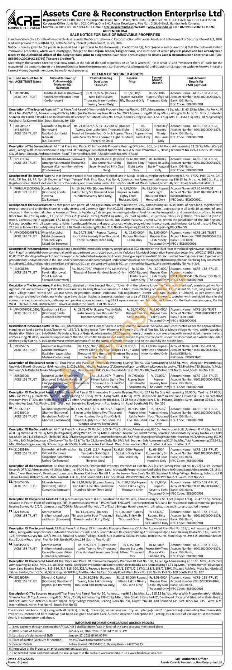 Description of The Secured Asset: All That Piece And Parcel Of Immovable Property, Bearing Plot No. 108 Admeasuring 42.38 Sq. Mtrs., Alongwith Proportionate Undivided Share In Ground Land Admeasuring 21.02 Sq. Mtrs, "divaine Residency-2", Developed Upon Land Bearing Revenue Survey No. 733, Block No. 753, Situated At Moje Hathuran, Sub-District & Taluka: Mangrol District: Surat, State: Gujarat-394125, And Bounded As: East: Plot No. 107, West: Plot No. 109, North: Road, South: Plot No. 119